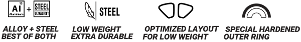Special hardened and nickel coated steel outer ring and aircraft-grade 7075-T6 aluminium inner ring. Will outlast an aluminium sprocket up to 3 times with up to 50% less weight compared to a normal steel sprocket.